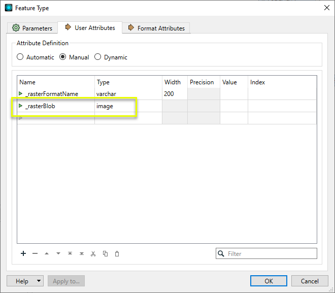 In the writer parameters, User Attributes, the Type of _rasterBlob is adjusted to Image, which is a binary field that supports larger values than varbinary, ensuring the data will not be truncated. (Note that the appropriate data type may vary between database formats.)