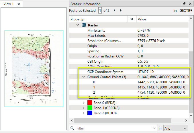 The output raster feature has new attributes containing the GCP Coordinate System, and the GCP points as a string. The original GCP raster properties remain intact.