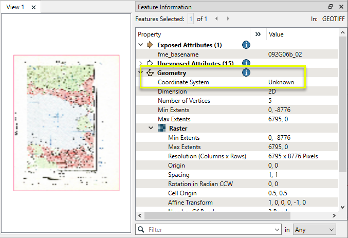 Note that the raster’s coordinate system is not known - it is not currently georeferenced.