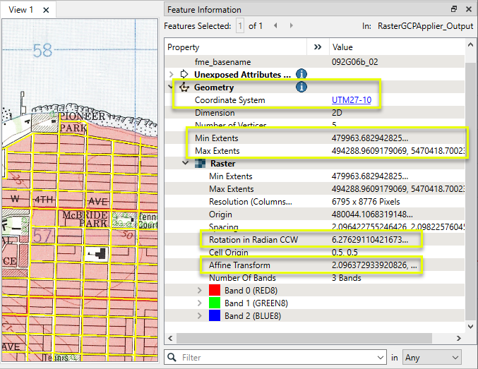 The output raster is georeferenced, with a Coordinate System of UTM27-10 and Extents that reflect valid ground coordinates. It is shown here in the FME Data Inspector with a current streets shapefile overlaid in yellow for context.