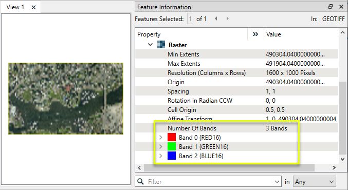 Note the individual cell values for the three bands, which fall in the range of 0 to 65535 (the possible values for a 16-bit band).