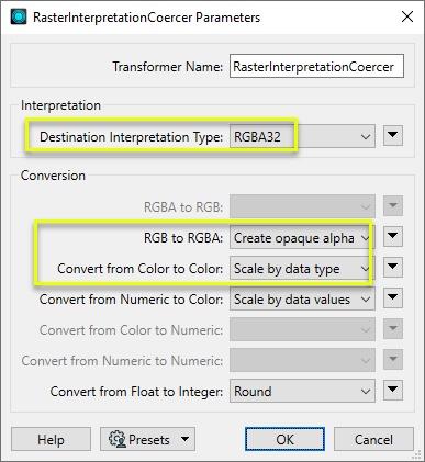 The RasterInterpretationCoercer receives raster features and converts all bands based on a chosen Destination Interpretation Type. Choices include: