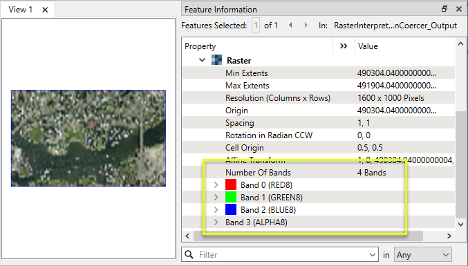 The output raster feature has four bands, including the new alpha band, and all are 8-bit.