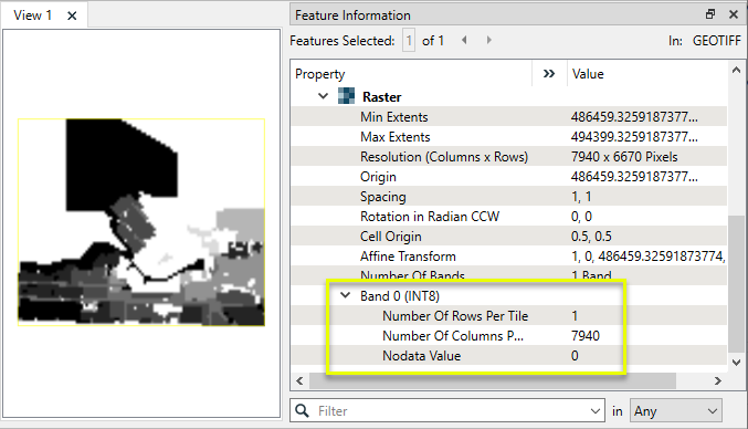 In this example, we will add a color palette to a single-band numeric raster. The original raster has cells with values ranging from 0 to 8, with 0 being the Nodata Value. Note that the band’s interpretation type is INT8, and it has no palettes.