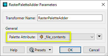 The final step is the RasterPaletteAdder. In the parameters dialog, Palette Attribute is set to _file_contents, which will retrieve the palette from that attribute and apply it to the raster.