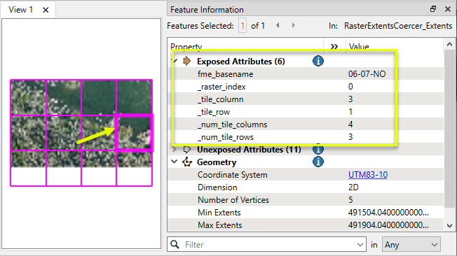 Twelve tiles are output, as shown here with their extents overlaid in pink. Note the new attributes which indicate the source raster, the number of rows and columns produced by the tiling operation, and this raster’s position. Row and column counts start from zero (0).