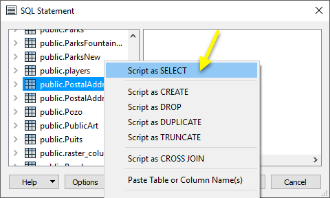 There is a convenient shortcut in the editor - by right-clicking on a table (or column) name under Database Tables, you can create a quick statement based on SELECT and more to start editing from.