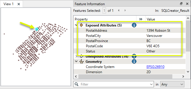 In this example, we will create a set of features by querying a PostGIS database, which has a table containing addresses with point geometry. We will use a SELECT statement that extracts a subset of the data based on postal code.