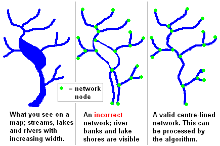 The image below demonstrates a map representation of a river network, an invalid network where lake and river bank sides have been digitally captured and a valid, topologically correct, center-lined river network which the algorithm can process.