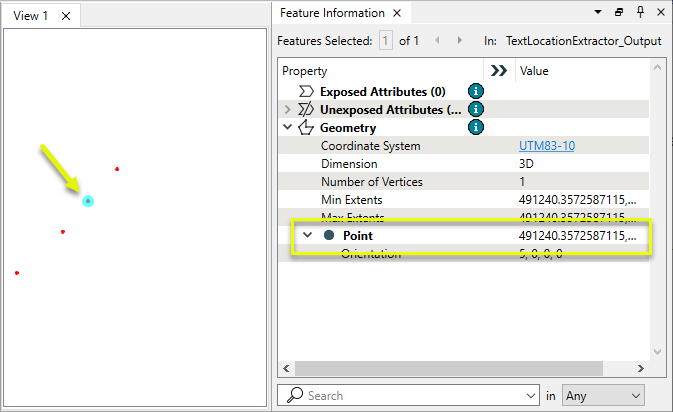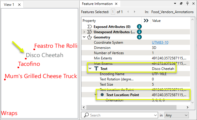 Note that in addition to the Text Location as Point coordinates, the selected feature also has aggregate multipoint geometry stored.