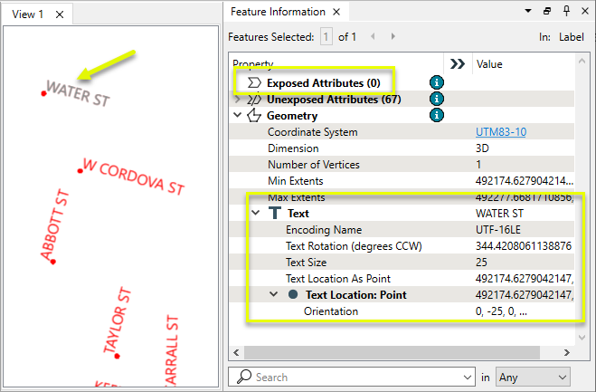The output features have new attributes, containing the text string, size, and rotation of the labels. The text geometry remains unchanged.