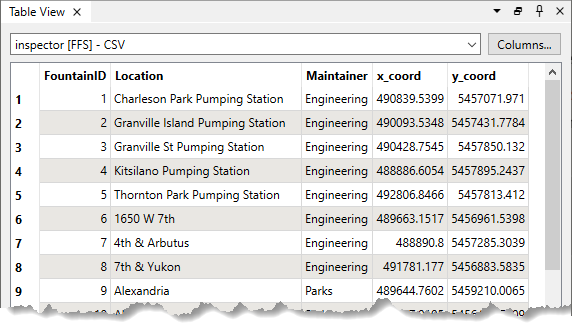 In this example, we have a CSV file containing locations of drinking fountains. We want to create point geometry from the coordinates.