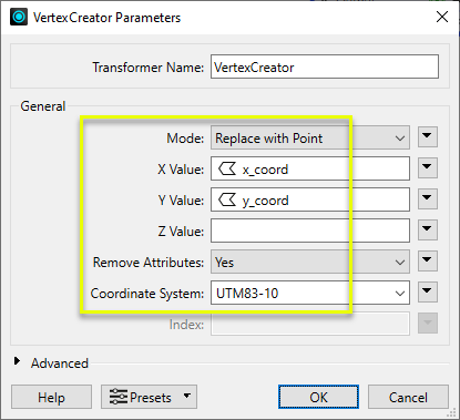 - This transformer requires explicit coordinates. To generate vertices based on geometry or spatial relationships see the Snipper, Densifier, Intersector, Clipper and various overlayer transformers.