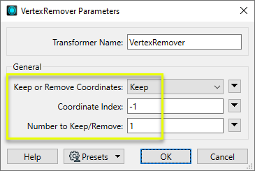 In the parameters dialog, Keep or Remove Coordinates is set to Keep. The Coordinate Index is -1 (representing the last vertex), and the Number to Keep/Remove is 1.