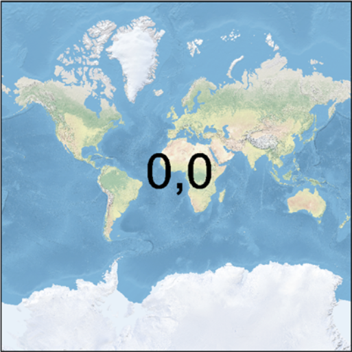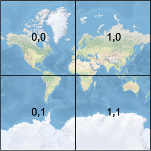 At level 0, the entire world is represented by a 256x256 pixel tile. Each level increases the number of rows and columns by a factor of two: level 1 is 512x512, level 2 is 1024x1024, and so on. The number of tiles is increased accordingly - 1 tile, 4 tiles, 16 tiles, and so on. GoogleMapsCompatible zoom level 0 tiles (column, row):