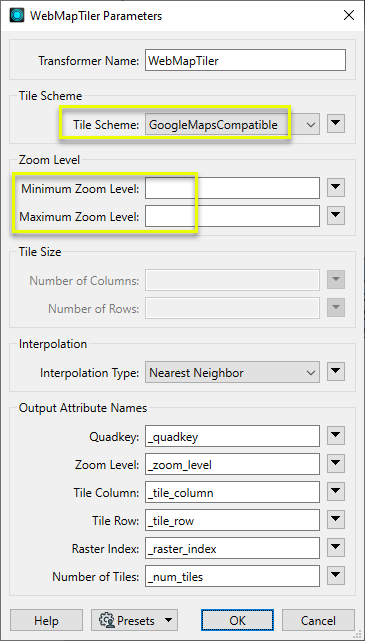 If these values are left blank, the transformer will calculate an appropriate range of zoom levels based on the input raster.