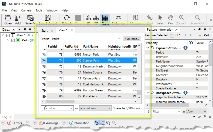 In addition to 2D or 3D view modes, you can view attribute data for features in table format. When either 2D or 3D view mode is active, the Table View appears outside of the View window, in another part of the interface (as long as it is selected in the View menu, under Windows). To replace the 2D or 3D data in the View Window with the Table View, click the Table View icon (