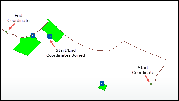 In this example, the starting and ending coordinates that comprise parks and a bicycle path are marked: