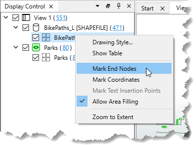 To view starting and ending coordinates, right-click on the view, dataset, or feature type in the Display Control, and select Mark End Nodes. To mark all start and end coordinates that display in the View, right-click on the view. To mark start and end coordinates of all features in a dataset, right-click on the dataset. To mark start and end coordinates of all features of a feature-type, right-click only on the feature type.