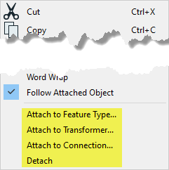 Select the annotation, then right-click to attach the annotation to any object or connection in the workspace. If the annotation is already attached, the Attach options will move the annotation. Additionally, a Detach option is available.