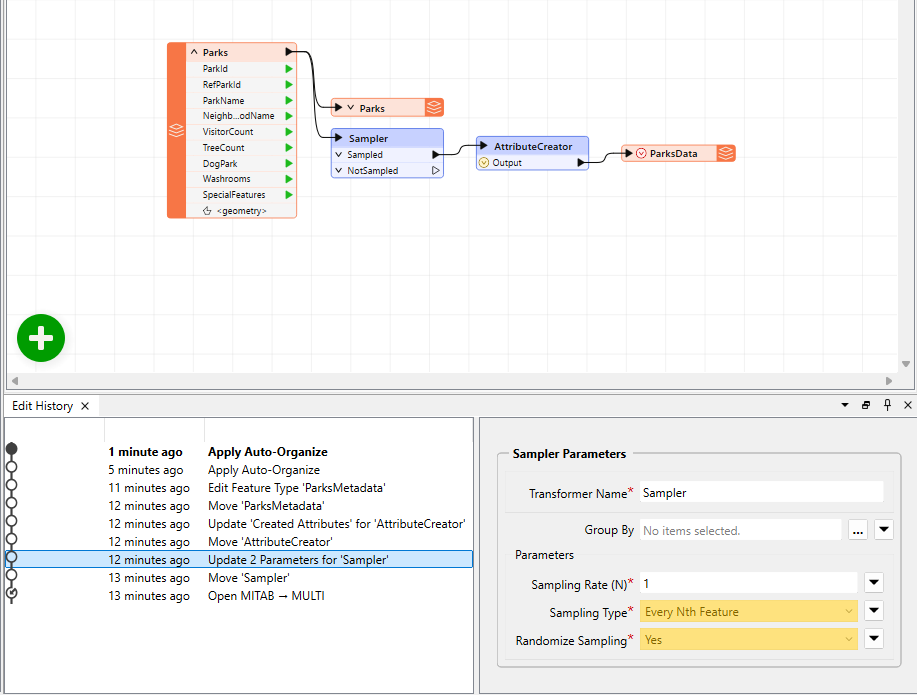 The Edit History window is a list of every edit made to a workspace in the current view, until the workspace is closed. The left panel of the window describes each edit. The right panel shows the canvas view of any edit selected on the left. For table modifications or transformer upgrades, the right panel displays views of both before and after the edit was performed.