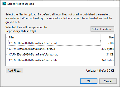At the top of the dialog is indicated where the files are uploaded in FME Flow. In this example, the files are uploaded to Repository, which means the repository specified in the Publish to FME Flow dialog.