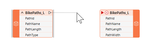 Feature Mapping is carried out by clicking on the output port of a source feature type, dragging the arrowhead across to the input port of a destination feature type, and releasing the mouse button.