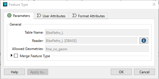 - Change a Geometry Type: To change the permitted geometry for a feature type, (for example change the permitted geometries from lines to points) open the Feature Type dialog. Click the Parameters tab. Choose from the list of permitted geometries. This field will be greyed out where the format permits any geometry type.