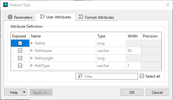 Above: The User Attributes tab shows a list of attributes present on the feature type. Each attribute is defined by its name, data type, width, and number of decimal places.