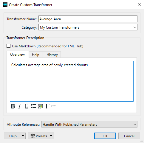 - In the Create Custom Transformer dialog, enter parameters for the custom transformer.