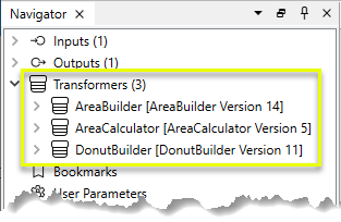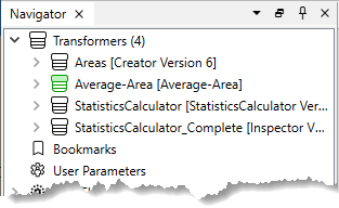 In the main workspace, the custom transformers, and their own parameters, are listed in the Navigator (much like any other transformer), except they appear as green icons:
