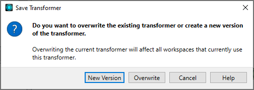 If a custom transformer is linked, you can create a newer version that contains any updates you made to it. After you create a new version of a custom transformer, the older version remains in any existing workspaces. However, that older version can no longer be added to any workspaces, either new or existing. Any subsequent times you add the custom transformer to a workspace will always reference the newest version.