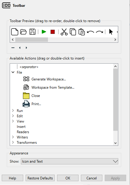 - Restore Defaults: Restores the icons that appear on the toolbar to the default configuration.