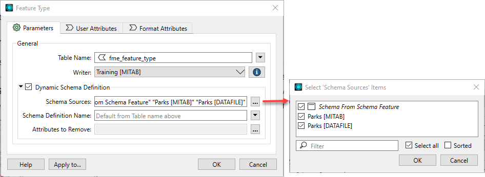 Schema Sources: Click the Browse button to select from a list of existing schema readers. Only the readers that you have selected will be used at runtime. If Schema from Schema feature is selected, the schema of the first feature to reach the writer is used. This option is useful if your workspace produces a user-defined feature that may not contain any actual data, but contains useful schema information. For more information, see Deriving Destination Schema from Schema Feature.
