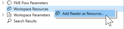 Select Build > Readers > Add Reader as Resource or right-click Workspace Resources in the Navigator: