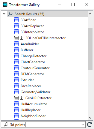FME Workbench displays a Search Results node that contains a list of transformers whose name or descriptions contain the matching keyword.