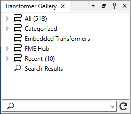 The layout of windows in FME Workbench may vary, but by default includes a Transformers Gallery pane: