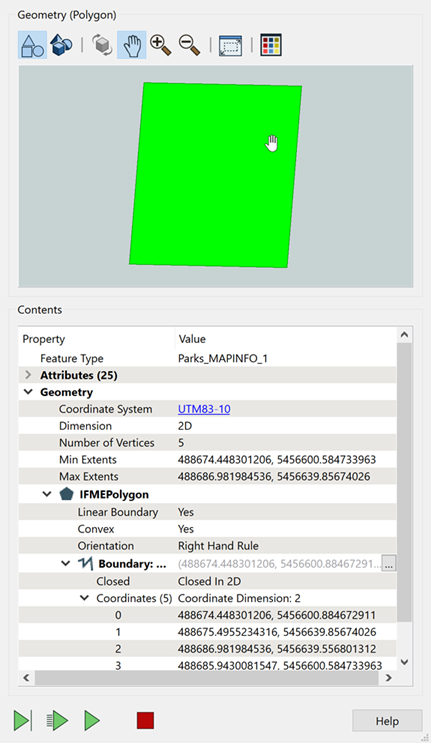 Displays all the geometry information for the feature, including the name of the FME Geometry Type to which the feature belongs.
