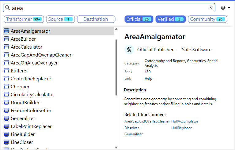 - Destination: In addition to writers, these results show transformers that write data to a destination external to FME Workbench; for example, FeatureWriter.
