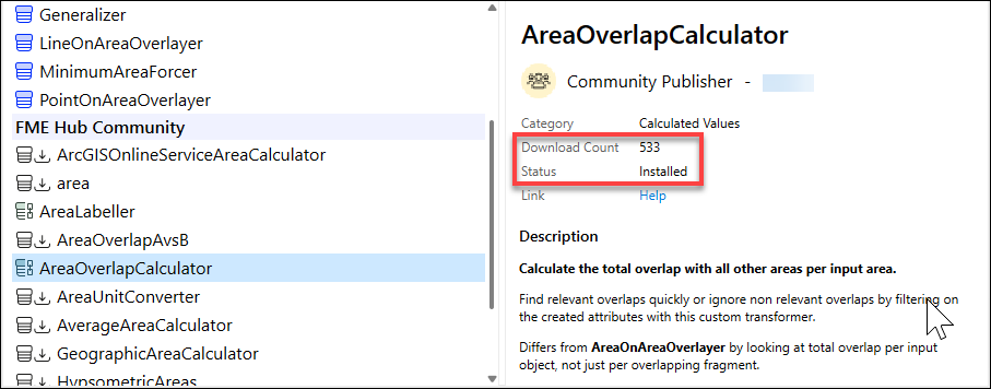 Additionally, FME Hub selections show the number of times the item has been downloaded by users, and an indicator if the item is already installed on your FME platform: