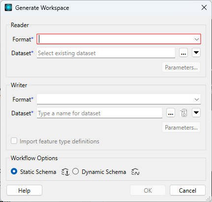 Static Schema is the default workflow, and is suitable for most workspaces. The schema is read from the source data and replicated on the workspace. Each reader feature type will be connected to its corresponding writer feature type.