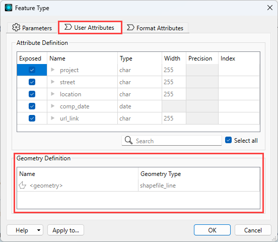 In formats that support reading or controlling the writing of geometric (spatial) data, a Geometry Definition table is visible in the User Attributes tab of a feature type.