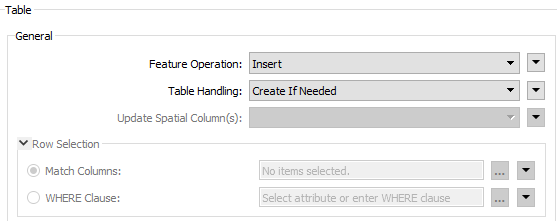 The writer appends a new row or updates an existing row(s) using input feature attributes and/or geometries. A selection method must be specified in the Row Selection group. |