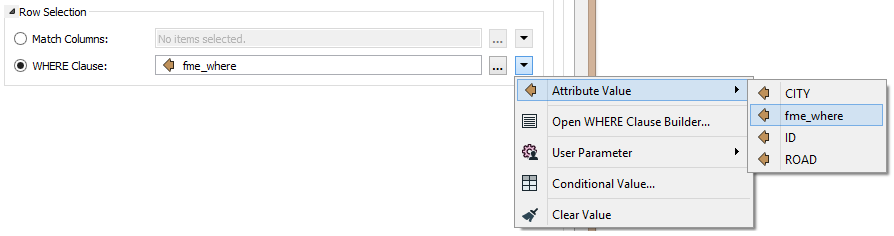 Row Selection is a writer format parameter group that is in effect only when the feature operation for a feature is Update, Upsert, or Delete. When modifying a table, a condition needs to be specified for selecting which rows to operate on. This parameter group offers two ways to construct the selection condition: