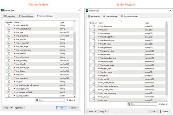 To expose a format attribute, open the Feature Type dialog, and click the Format Attributes tab. Locate and select the Format Attribute to expose. Click OK to make the format attribute available for use in Workbench.