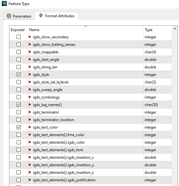 Format Attributes are used to control features. To avoid cluttering the workspace, these attributes are not all visible by default. To make them visible is known as “exposing” them, and involves the Feature Type dialog.