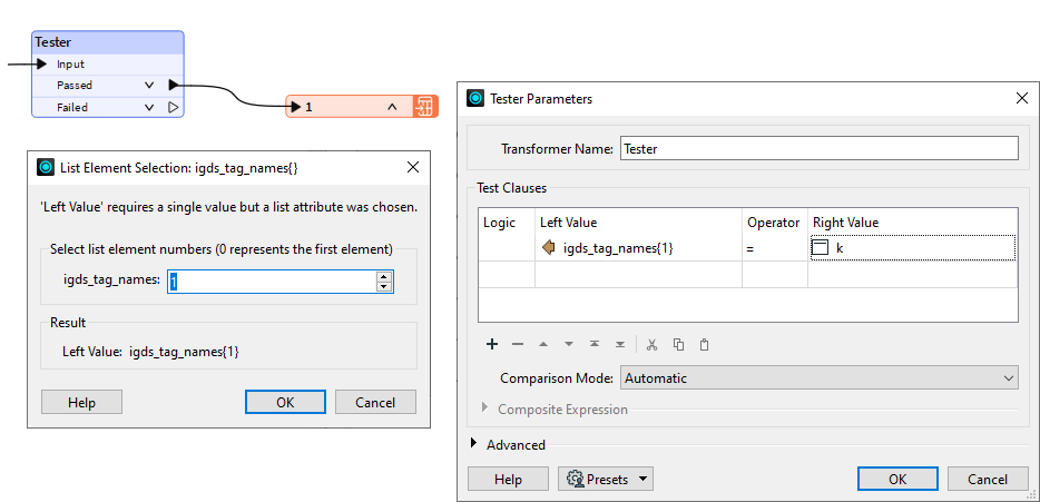If we attempt to use that attribute in a Tester transformer, we are prompted to choose which element in the list is to be tested. Because transformer dialogs ask which element in a list is to be used, it is not necessary to have to expose multiple elements solely to get access to a single one.