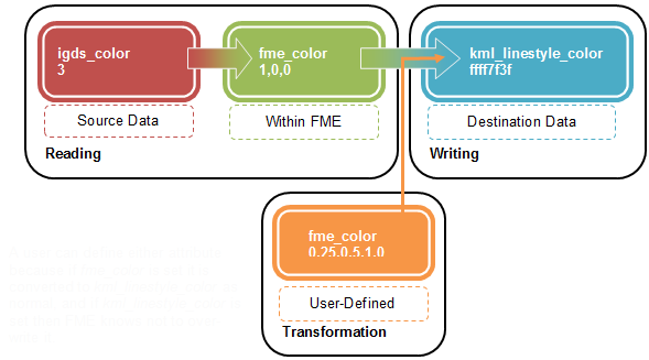 In other words, setting a format attribute may cause a transformation in the data to take place. Either the writer format attribute (here kml_linestyle_color) or the equivalent FME attribute (here fme_color) may be set to achieve the same end.