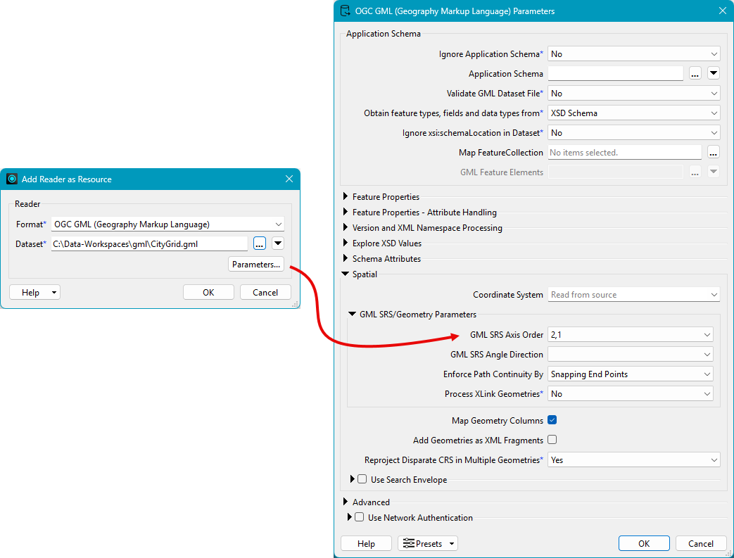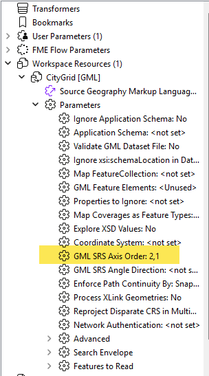When the workspace runs, the Generic reader uses this resource to read GML data with the desired SRS axis order.