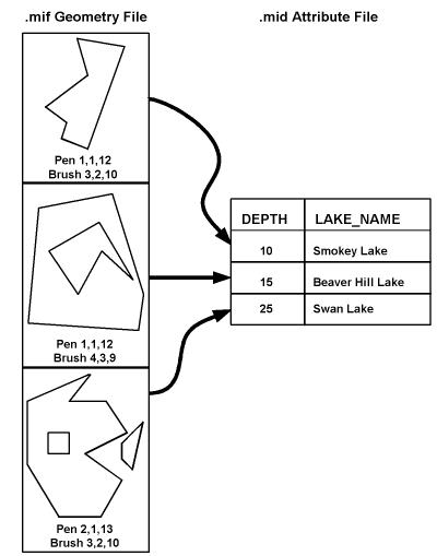 Each geometric entity present in a .mif file has display properties such as pen and brush width, pattern, and color. In addition, each entity has a row of attributes stored in an associated .mid file. A single .mif file contains many different types of geometry; however, the associated attribute in the .mid file must have the same number and type of fields for each entity in the .mif file. The order of the entries in the two files is synchronized. For example, the second geometric entity in the .mif file has the attributes held in the second row of the .mid file.